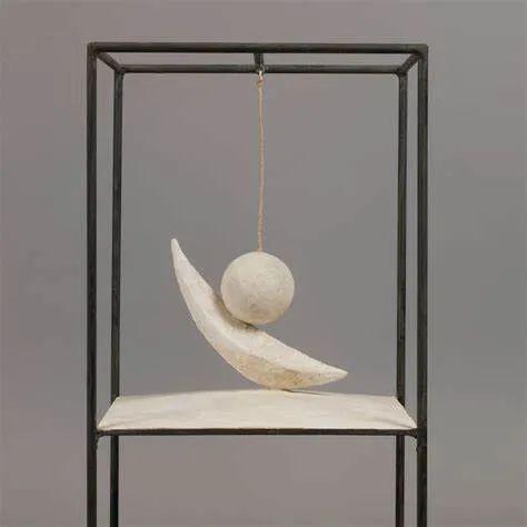 尽管物由人创作,但“OOO”作品甚至提出了一种“悖论”,它更感兴趣的是“想象”物如何存在、行动和“生活”,尤其是超出人类感知的领域,我们肠道中的细菌又想要什么?这件作品想要什么?我们注意到一些作品像浮雕一样面对着观者展开,和墙面之间并未直接连接,“底座/场地”犹如贾科梅蒂《悬浮球》(见图1)的“牢笼”,与现实世界保持距离,这种疏离感使作品遁入自足的情境,为我们开启了另一重体验:人类无法进入的领域。这些奇异的体块在缩微的尺度中互相发酵,物体似乎隐藏着超出我们理解的能力。它们如同废弃的神秘花园,抛却了清晰的功能,失去了历史文脉的联系,摆脱了标准的形式。作者的意图或心理,表征与情感这些“人类中心的自负”统统消失,零度的废园开始建立。