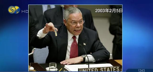 2003年2月,时任美国国务卿鲍威尔前往联合国安理会展示一瓶装有白色粉末的试管,声称这就是伊拉克研制化武的证据,要求联合国批准美国派兵到伊拉克搜查和处理。