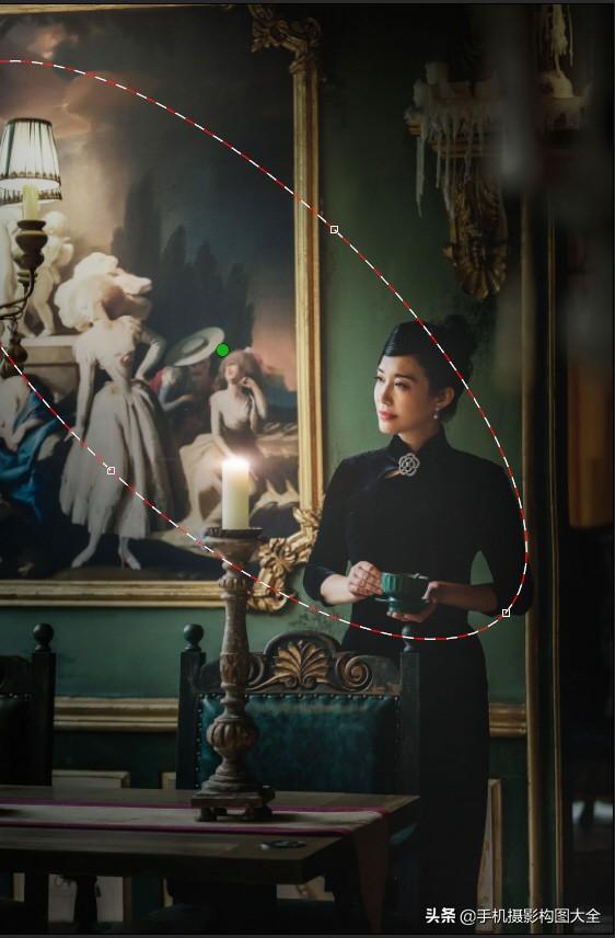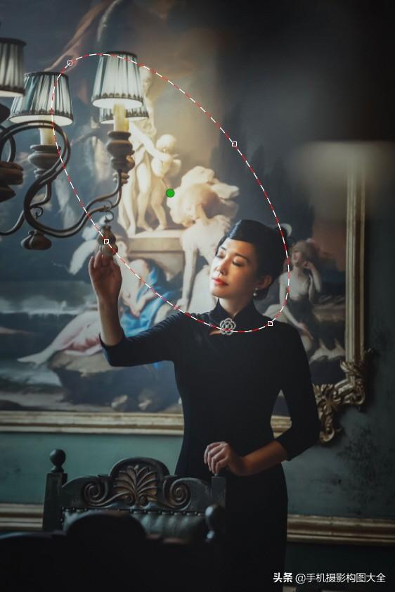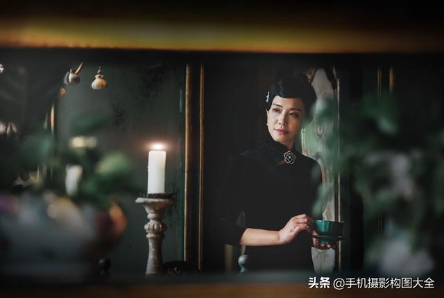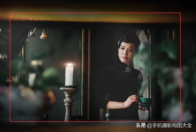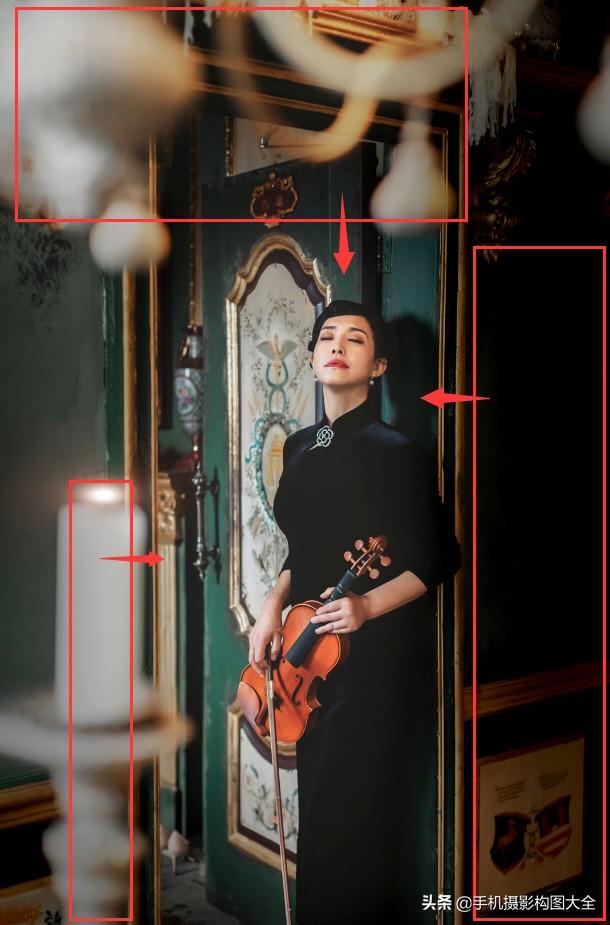 前景蜡烛为亮,上方灯饰为亮,右边背景为暗,人物居于其中,正好是光影框式的中心。