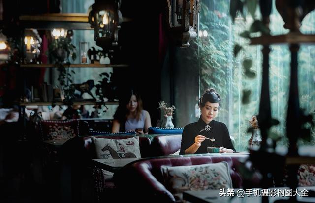 上方的架梁,左右的盆景,都已经虚化,刚好形成的框式中心,人物清晰、明亮可见,主体突出。