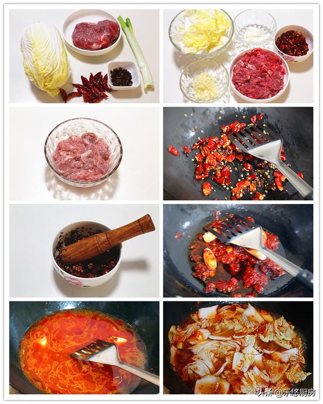 第二步:尽量将牛肉上的筋膜都去掉,然后切成3厘米大小、2毫米厚的肉片。白菜梆斜刀切片,白菜叶用手撕成大块。干辣椒剪成段,葱切段,蒜切末备用。