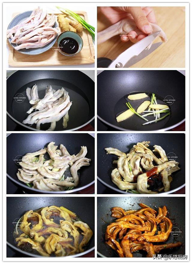第一步:准备食材。鸭掌500克、姜少许、香葱少许、蚝油适量。