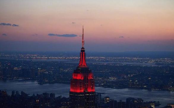 △美国曼哈顿高楼帝国大厦在中国农历除夕和正月初一当晚都会亮起红、蓝、黄三色彩灯庆祝春节