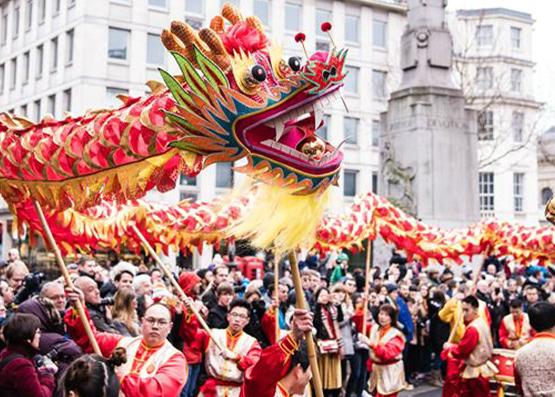 △英国伦敦特拉法加广场举办春节舞龙表演活动
