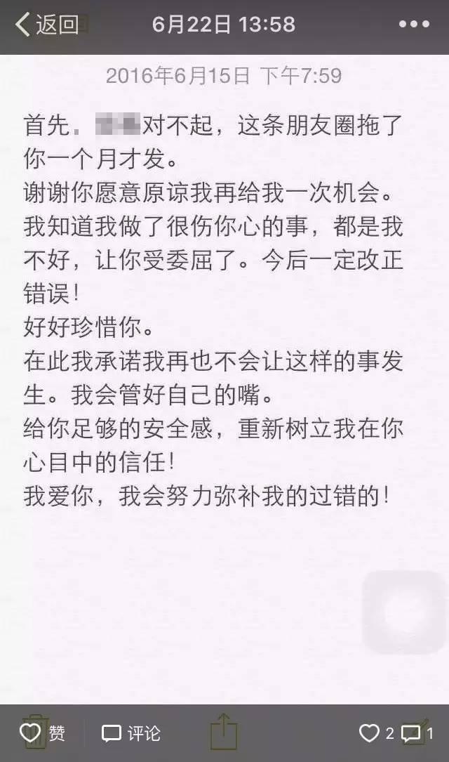 在一起一年半了。一条是生日前一个月我发现他和别人搞暧昧。我说,你在我毕业典礼上拉个横幅和我道歉,发一条道歉的朋友圈,以后每个月发一条关于我的朋友圈。我就原谅你。他是一直不肯发朋友圈的人。关于我的也只有15.16年的1月1日发过。拖了一个月我都没给他好脸色,后来还是发了。我就原谅他了。