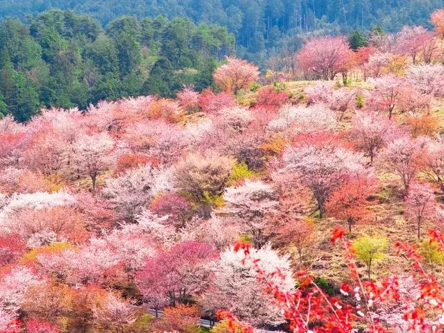 吉野山位于奈良的中央部,南边与大峰山脉相连。自古以来以樱花盛开而闻名。春天漫山遍野的粉樱,被称为“吉野千本樱”。当然秋季的红枫叶、冬季被白色笼罩的景色也是美丽非凡。
