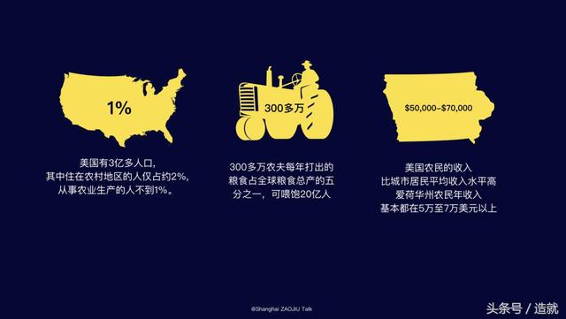 美国只有3亿人,农村人口不到2%,农业从业人口只有1%,也就是说300万个农夫种出了全世界五分之一的粮食,可以养活20亿人。换句话说,它不仅能够养活两个美国的人口,还能养活整整一个印度。