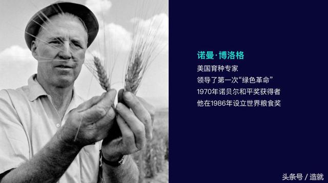 美国著名的育种学家诺曼·博洛格领导了第一次绿色革命,他培育出的矮秆小麦,拯救了南亚次大陆10亿人。因此,他获得了1970年的诺贝尔和平奖,这是诺贝尔和平奖,第一次授予一个农业科学家。他在1986年设立了世界粮食奖,这个奖成为了世界粮食发展的风向标。