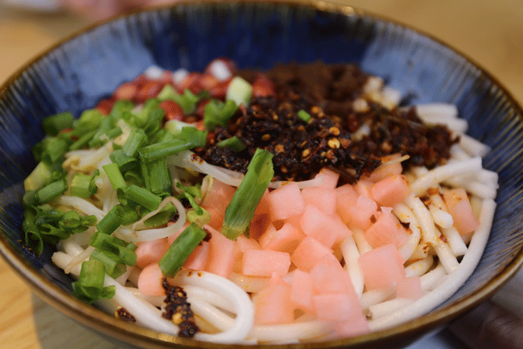 一把酸粉,加入开水锅中烫熟,再加入适量味精和酱油以及事先准备好的葱花、泡菜、花生米。末尾,淋上一勺精心秘制的红油辣椒。一碗素粉,又糯又滑,一嗦,美味就从口腔走到了贵阳人的心中。