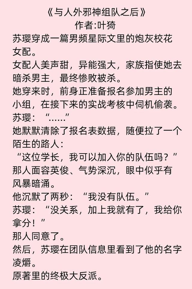 苏璎穿成一篇星际升级文里的反派炮灰,为了逃离剧情,她邀请一个路人组队以完成考试,却发现对方竟是原著里的终极boss。两人阴差阳错成为队友,苏璎也就此开始瑰丽多彩的星际之旅,她探索着神奇的异能,邂逅各种古老神奇的异族,在广阔无垠的世界里遨游。