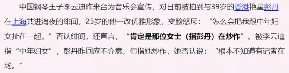 但李云迪的脾气却暴躁,对记者说肯定是彭丹找人拍的,怎么会把我跟中年妇女扯在一起呢?随后又在社交平台上澄清自己忙着工作没有恋爱。