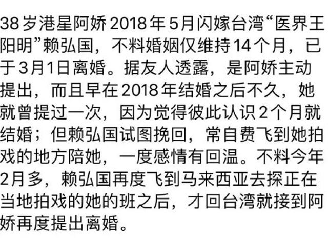 根据媒体报道,阿娇和赖弘国已经在3月1日就离婚了,而且根据透露还是阿娇先提出的离婚要求,还是在2018年结婚不久就提出过一次,在赖弘国的挽回下感情升温,不料今年2月份阿娇再度提出,赖弘国无法挽回只能答应。