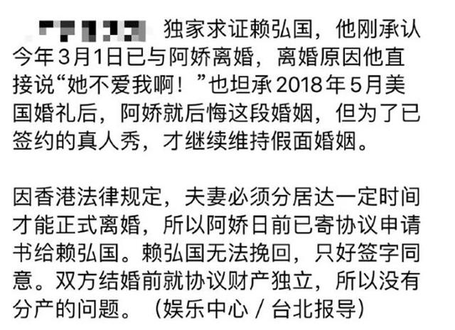 而媒体还称求证了赖弘国,得到了他本人的承认,并且亲口说出了离婚的原因:“她不爱我啊”。据悉两人由于结婚前就协议财产独立,所以并没有分割财产的问题。