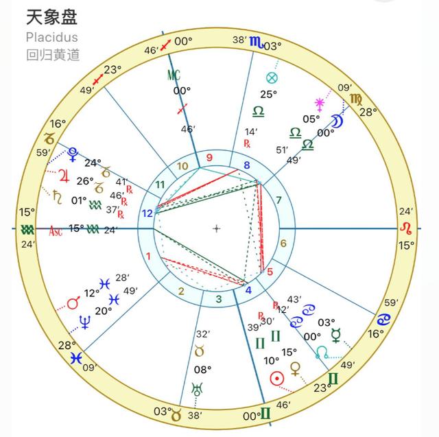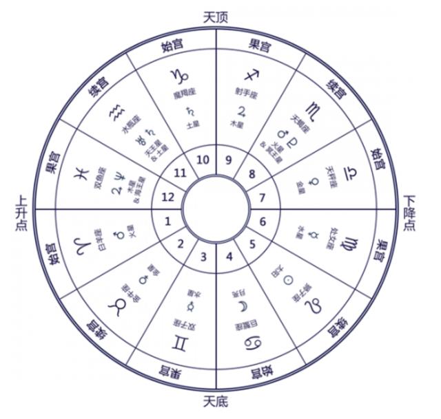 如上图,内圈有一圈数字1-12个数字标注的扇形区域就是宫位。原始的星盘中,宫位和星盘是对应的,白羊座的先天宫位是1宫,以此类推。在我们按照日期和地址生成的星盘中,星座会落在不同的宫位,因为宇宙天体在运动。