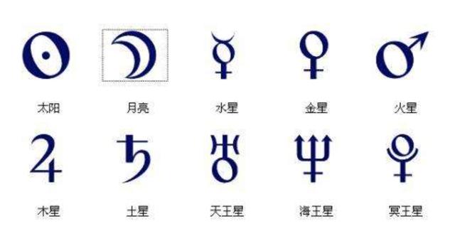 10大行星:太阳、月亮、水星、金星、火星、木星、土星、天王星、海王星、冥王星。前5个属于内行星,在占星符号语言中,对性格影响较大。后5个属于外行星,木星、土星是社会行星,三王星属于世代行星,时代的印记重些。它们对应的符号如下图。