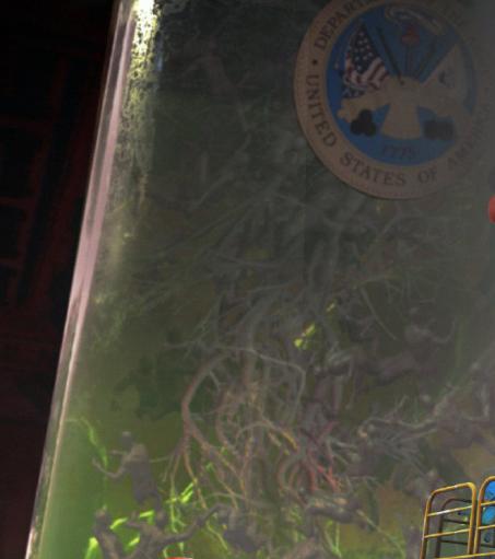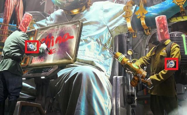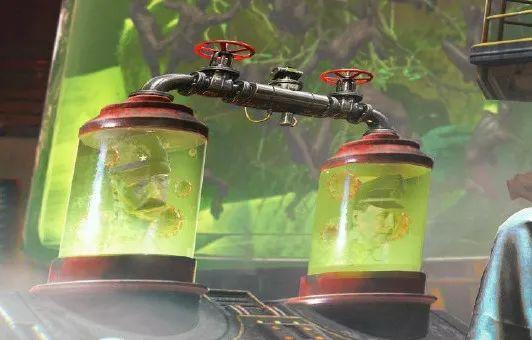 底部两个大玻璃罐子里左右各泡着一个人头,分别像日本军人和德国纳粹,里面还漂浮着很多病毒,暗示这一实验以他们曾进行的人体实验为基础。