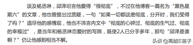 不懂恋爱8个月,因为聚少离多加上邱泽的冷暴力,两人分手。多年之后,杨丞琳说邱泽伤她最深,后来干脆表示不认识邱泽。邱泽则说“自己爱得很彻底,现在的杨丞琳已经不是当初的她了。”