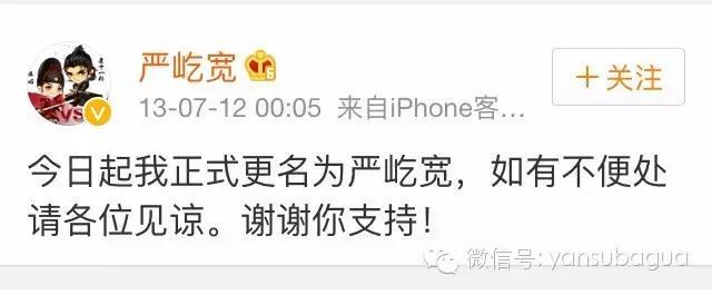13年,严宽还在微博宣布自己改名叫严屹宽……