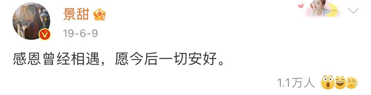 然而这段看似甜蜜的感情还是没能走到最后,2019年6月9日,景甜在社交平台上发文“感恩曾经相遇,愿今后一切安好”,正式宣布与张继科分手。