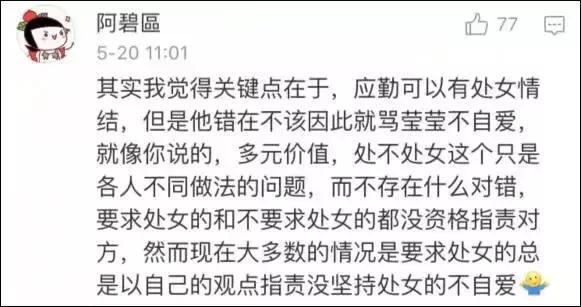 而且在有人为非处女辩解的时候,他们总会用恶意揣测别人,“为非处女辩护的都是biao子”。