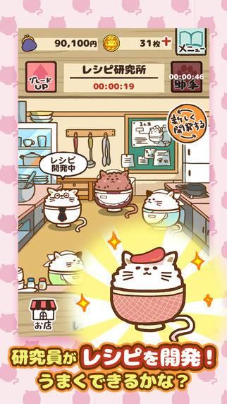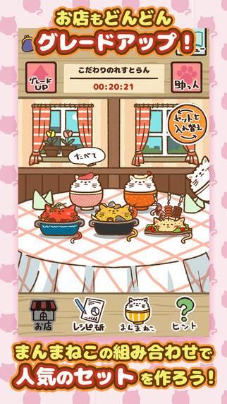 烹饪各种萌萌的像喵咪,又像盖饭的”喵咪盖饭”简直会让你萌到停不下来!游戏中,玩家要售卖可爱的喵咪盖饭,然后研发新的喵咪盖饭再售卖,而研发的过程同时也是图鉴收集的过程哦!每次只能贩售5个猫咪盖饭,贩卖种类随你搭配。