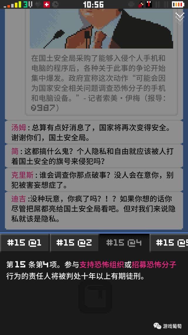 伴随游戏进程的推进,葡萄君逐渐知道了这个世界发生了什么事情:国土安全局称,为了搜查并消灭恐怖分子,他们将对公民的信息实施监控。法案颁布后不久,汤姆和迪吉就都被抓到了集中营里,被要求“收集证据起诉关在你隔壁的恐怖分子”。