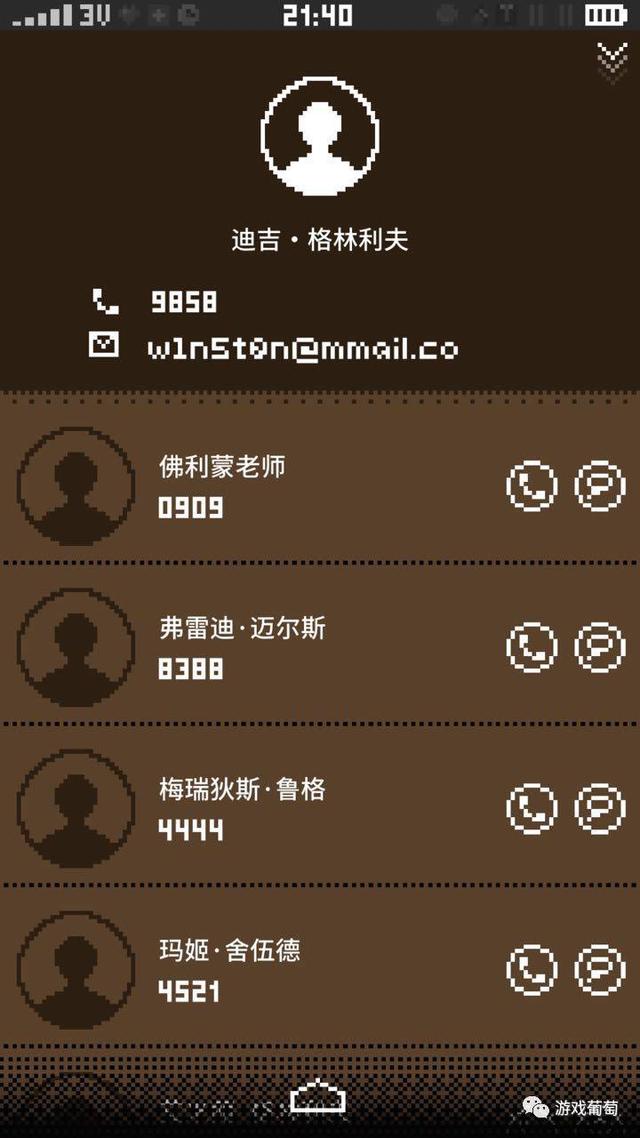 打开通讯录,可以看到手机主人的信息,以及亲朋好友的电话号码和联系方式。同时,点击右侧的拨号键和短信键还可以跳转到其他界面。在尝试拨号之后,不同的人物还会有不同的反应。