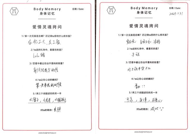 有个一家四口,爸爸妈妈带着哥哥妹妹一起来做双手复刻。“动手前”,爸爸妈妈需要填一份问卷:“你们第一次见面在哪?穿什么衣服?收到的礼物中最喜欢的是什么?”爸爸妈妈有点脸红得不好意思,一旁的娃则呵呵地笑个不停。