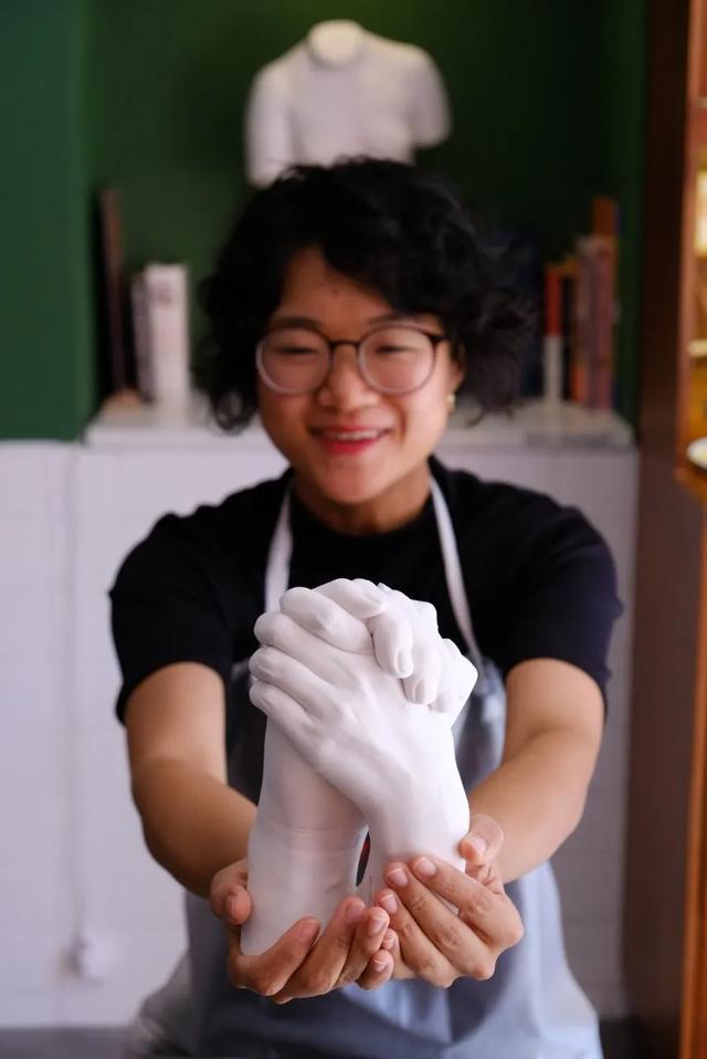 这份特殊礼物的创意,源于上学时一堂关于翻模工艺的课。二十多个同学的手部模型排成一排时,周易仿若看到了每个人在她心中存储的画面:“他的个子很高,但他的手却很小”,“她很爱笑,原来手是这样肉肉的”。