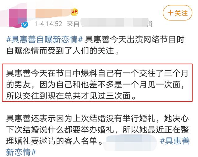 1月4号,多家媒体报道称,具惠善在综艺上自曝了新恋情,还聊起婚礼的事情,说上次结婚没办下次一定会办,这进展简直让人吃惊。