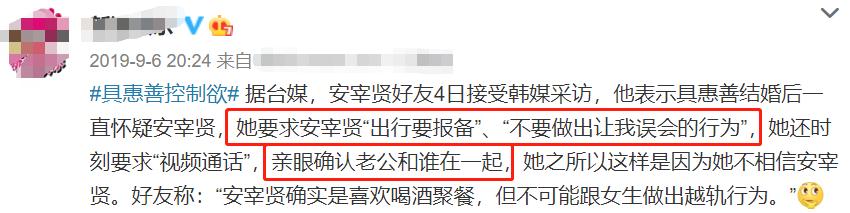 这一段是他俩当时闹离婚闹出来的,“具惠善控制欲”还上过热搜,她被曝要求安宰贤出行报备,时刻要视频电话确认位置。