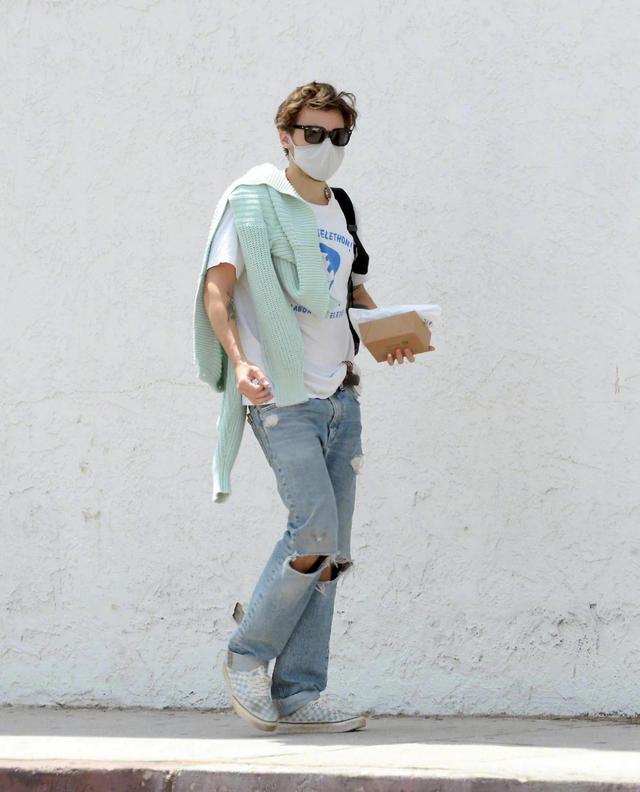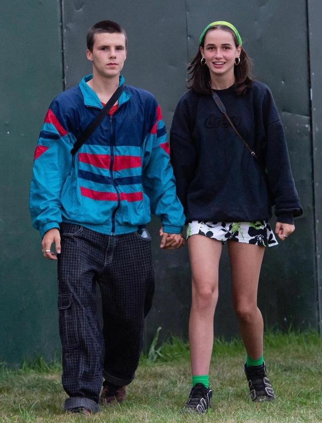 小贝的小儿子也恋爱了,这时尚感不输老爸老妈呀。蓝色的上衣加上小色块的碰撞,看起来很吸睛。下装选的是宽宽大大的纸袋裤,虽然显腿短但确实很有型。