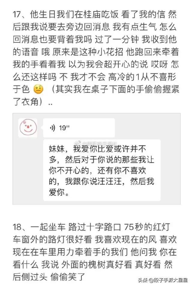 @是你的小陶噢: 暧昧期的时候一起玩完回家之后我问他开心吗,他说:天气好,喜欢的人也在身边,很开心。当时真的很心动