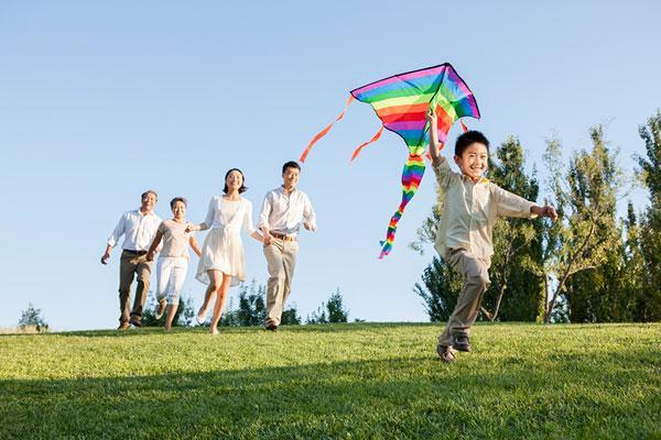 远处,小明一家也在草坪上放风筝,小明拉着线在快速地奔跑,妈妈高高地举着风筝,爸爸负责当指挥,望着刚刚飞上蓝天的风筝,看着越飞越高的风筝,一家人开心地笑了。