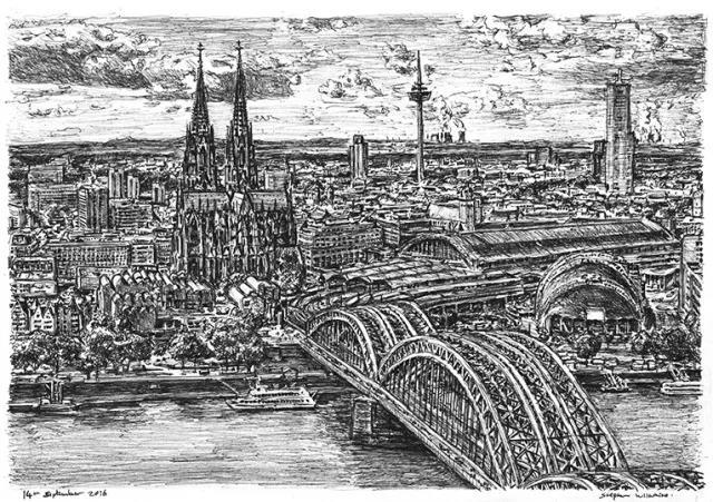 斯蒂芬·威尔特希尔(Stephen Wiltshire)和他绘制的城市天际线远景图。