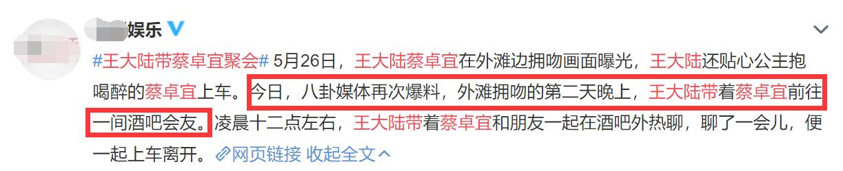 1月中旬的时候,王大陆还曾公开发文向蔡卓宜喊话:“遇到喜欢的人就和哥哥说,哥哥帮你搞定”。本以为两人是“纯洁”的兄妹情,却没想到王大陆是在帮自己解决新恋情。