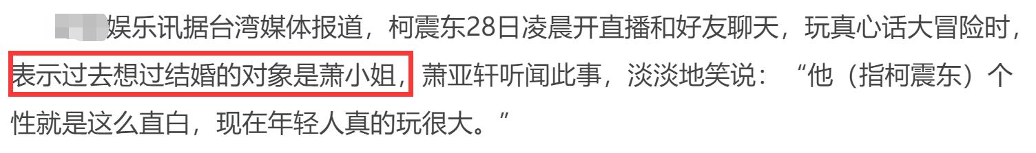 柯震东也曾在直播中坦言,自己过去想过结婚的对象是萧小姐。对此,萧亚轩也只是淡淡一笑。