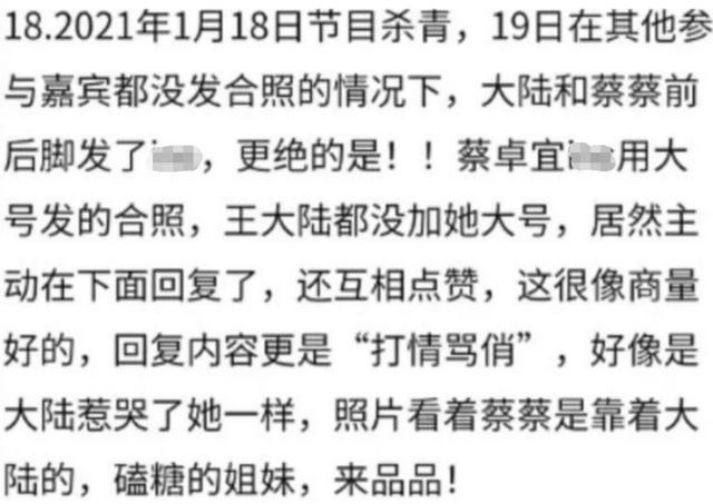 表面上,两人结缘自综艺节目《怦然再心动》。但有网友发现,王大陆与蔡卓宜其实早在今年1月就已经明显不对劲,在节目中的互动也非常暧昧。