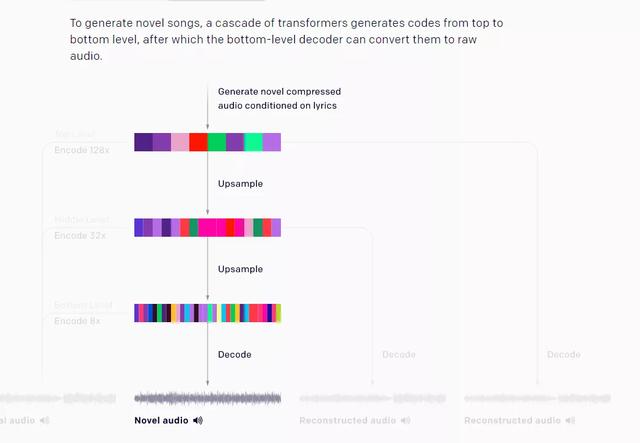在生成音乐时,一系列的转换器会从上到下生成代码,然后,凭借下层的解码器就可以将它们生成新的音频。